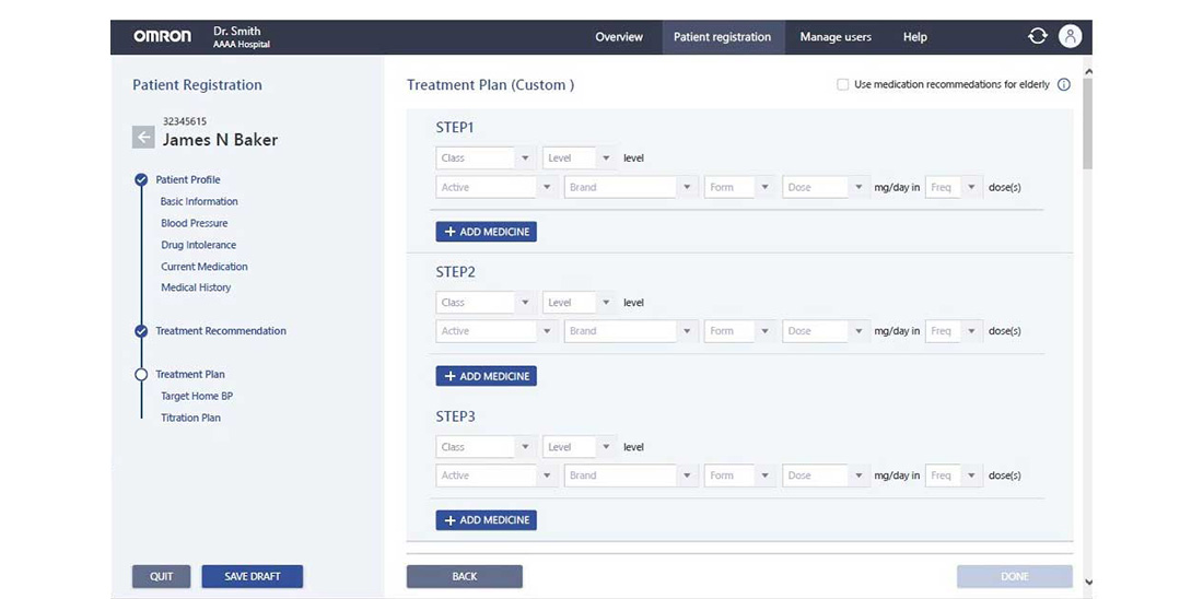 Hypertension Plus recommends a customized medication plan for each patient to their doctor, serving as guidance for anti-hypertensive drug treatment depending on age group and complications. The recommendations are based on clinically proven medication titration techniques conforming to hypertension guidelines by the National Institute for Health and Care Excellence (NICE). Hypertension Plus draws on the TASMIN* home blood pressure trials, a clinical study conducted at the University of Oxford that proved the potential to reduce blood pressure through a self-management and medication self-titration program . Patients are provided with a pre-determined three-month medication plan, meaning they do not need to visit their GP’s office every month, and doctors can make more effective use of consultation time. Patients can share self-measured blood pressure readings and any subjective symptoms with their doctors. This means medication administration tasks by doctors and healthcare professionals can all be completed online. An alert function continuously supports patients in taking the right medicine and improving medication adherence.