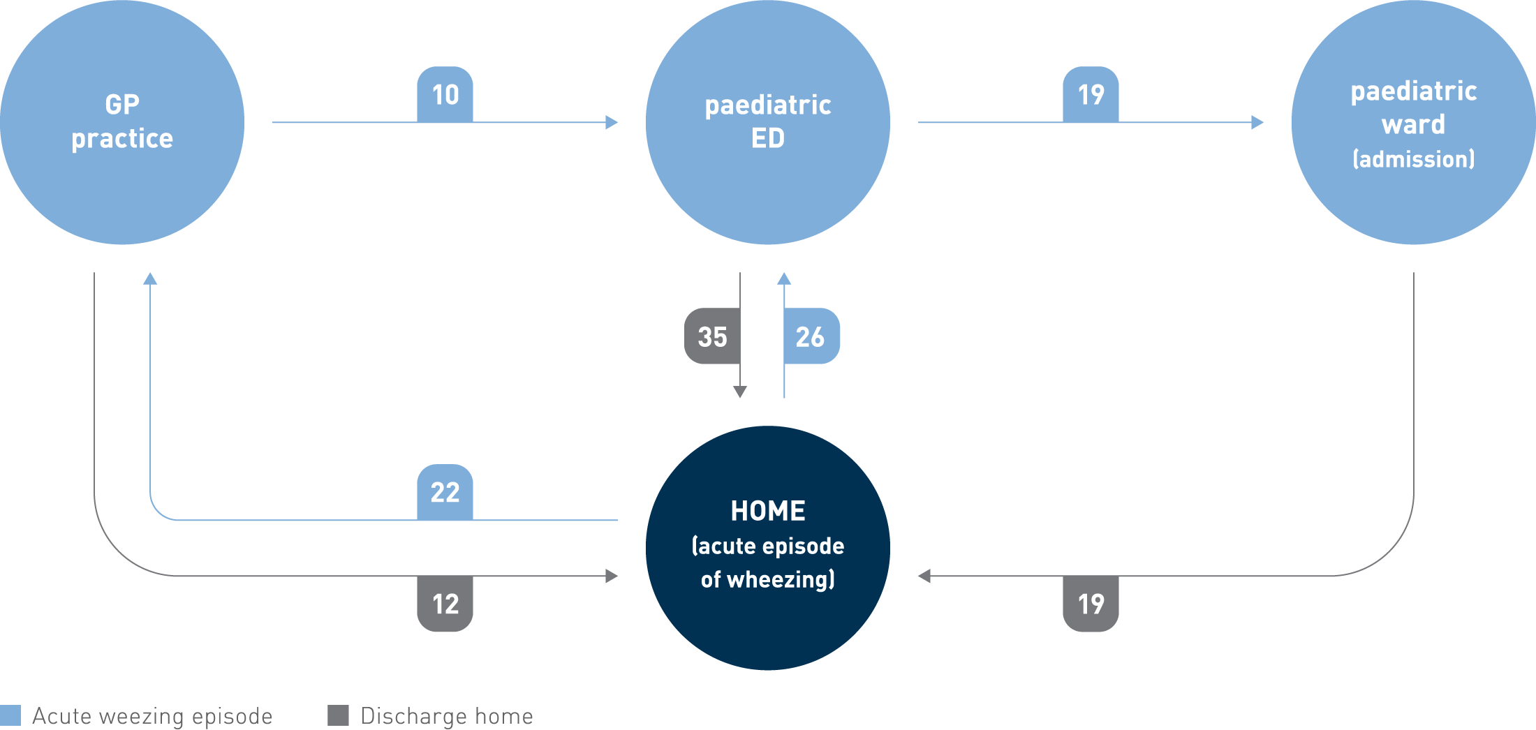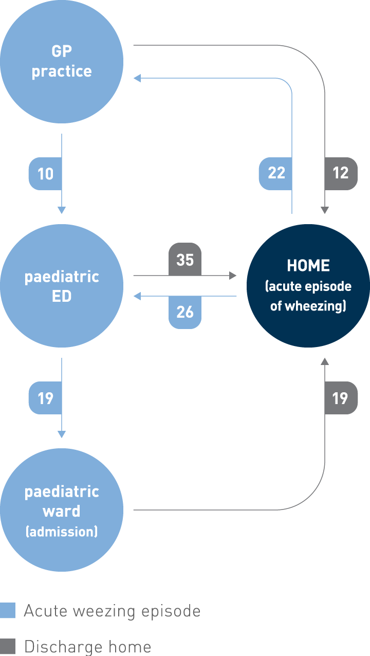 Process map describing patients’ journey during the first episode of wheeze they recall needing to seek for medical support – the blue color indicated admission with acute wheeze and the grey color indicates discharge – the number of parents who have described each journey are added next to each arrow.