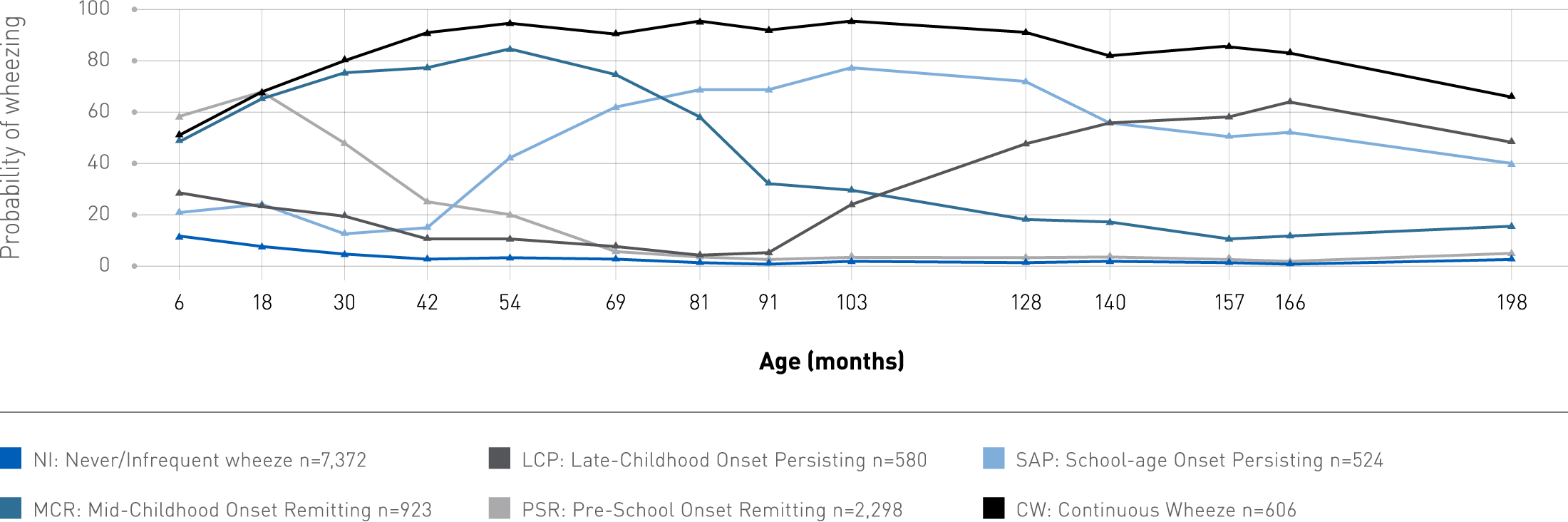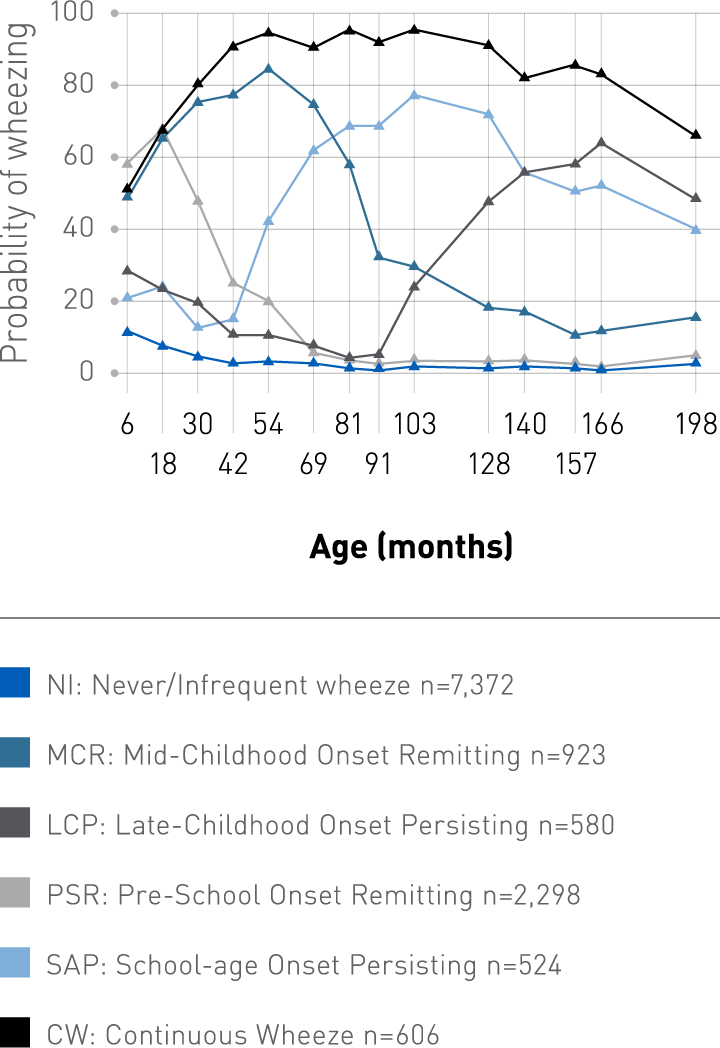 Six wheezing phenotypes are identified: never/infrequent, preschool-onset remitting, midchildhood-onset remitting, school age-onset persisting, late childhood-onset persisting, and continuous wheeze.¹²