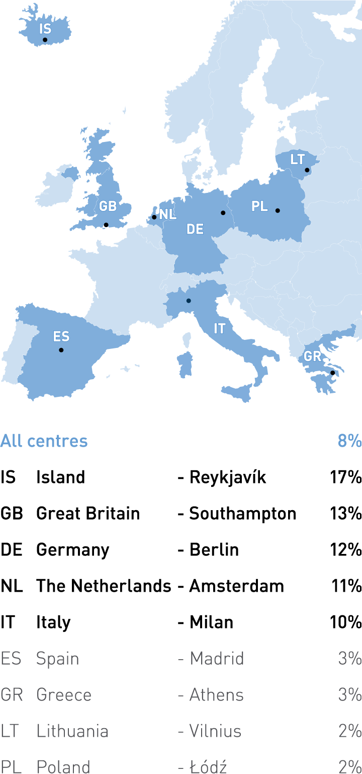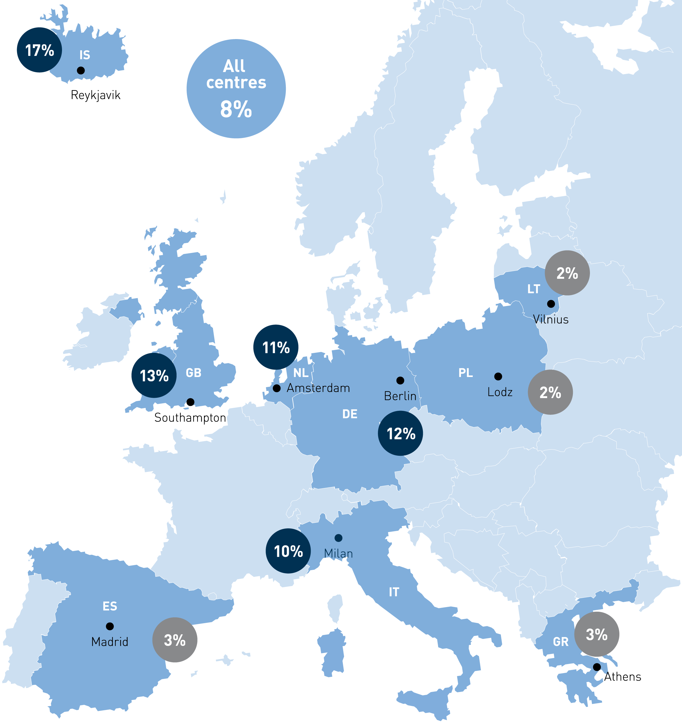 Map showing study centres and the prevalence of wheeze in the second year of life in each centre (adapted from Keil et al.)¹³