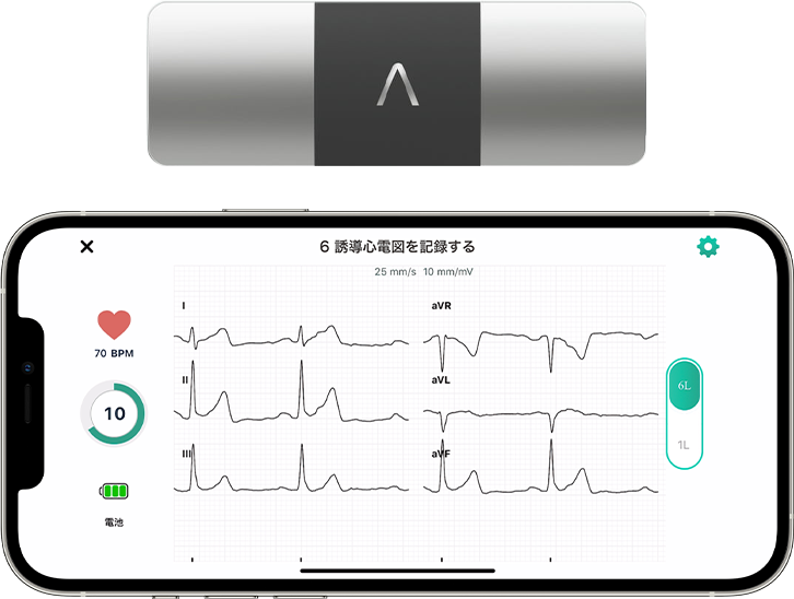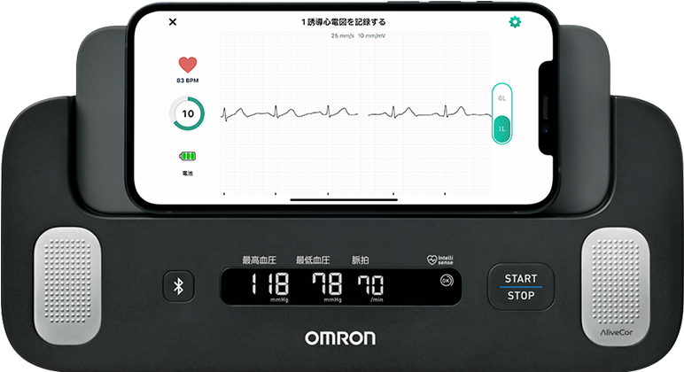 Palm-sized portable ECG. An ECG can be recorded at any time during subjective symptoms such as an arrhythmia occurs. Two types of electrocardiograms can be recorded (1-lead and 6-lead). Analyze the ECG reading with OMRON connect, the smartphone app and show the analysis results such as "possibility of atrial fibrillation".